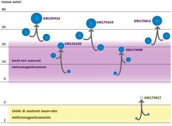 b. Le masse dei sistemi binari rivelati da Ligo e Virgo, confrontate con quelle note tramite osservazioni elettromagnetiche, indicate dalle bande colorate. Il corpo risultante dalla fusione delle due stelle di neutroni potrebbe essere un’altra stella di neutroni immediatamente collassata in un buco nero.