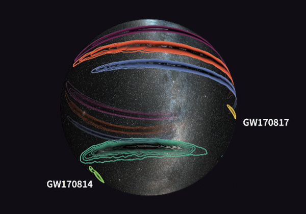 c.Incertezza nelle aree di provenienza delle onde gravitazionali rivelate da Ligo e Virgo. Le linee colorate indicano le probabilità associate all’area inclusa (dal 90% per la linea più esterna, al 10% per la linea più interna). Le aree più piccole, indicate dalle sigle, si riferiscono ai due segnali misurati con tutti e tre gli interfometri (i due Ligo e Virgo): GW170814 è il segnale proveniente dal sistema binario di buchi neri, GW170817 quello proveniente dal sistema binario di due stelle di neutroni. I due eventi registrati da Ligo e Virgo mostrano una incertezza oltre 10 volte inferiore rispetto agli eventi registrati dai soli interferometri Ligo.