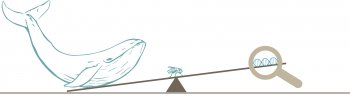 b. Rappresentazione delle scale di massa coinvolte nel meccanismo . I rapporti tra le masse di balenottera, moscerino e Dna (che rappresenta la piccolissima massa dei neutrini) sono approssimativamente gli stessi che intercorrono tra le tre scale di massa del meccanismo.