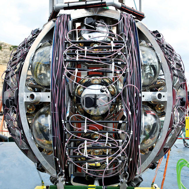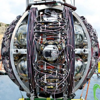 Una stringa del rivelatore Km3net-Arca, equipaggiata con 18 moduli ottici. Ogni stringa è alta 700 metri e viene deposta a 3500 m di profondità al largo di Capo Passero (Mar Ionio). Durante la posa la stringa è avvolta nel suo modulo di lancio, una sfera di appena 2 metri di diametro. L’ancora e una boa (non visibile nella foto) permettono di mantenere la stringa in verticale sott’acqua.