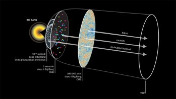 È ormai familiare a tutti, a differenti livelli di profondità, l’idea fondamentale della teoria del Big Bang “caldo”: cioè che l’universo sia in continua espansione, a partire da uno stato iniziale molto denso e caldo (circa 13,8 miliardi di anni fa), in cui era “tutto in un punto” - che è anche il titolo di un celebre racconto di Italo Calvino (da “Le Cosmicomiche”). Ciò che oggi fa parte del nostro modo di pensare quotidiano, ha rappresentato negli anni ’20 dello scorso secolo una nuova vera e propria rivoluzione copernicana. Possiamo osservare l’universo nel corso della sua evoluzione e tracciare gli stadi attraverso i quali è passato, dalla sua infanzia sino ad oggi? La risposta è sì, e questo anche grazie al fatto che la relatività ci insegna che non è possibile trasmettere alcun segnale a una velocità maggiore di quella della luce. Questo significa che, osservando, ad esempio, una galassia a una data distanza da noi, i segnali luminosi che riceviamo ne sono una otografia scattata al momento in cui sono partiti, e ci informano sulle sue proprietà a un tempo via via più remoto, man mano che la distanza diventa sempre più grande. Se potessimo osservare sorgenti poste a distanze di 13,8 miliardi di anni luce, avremmo un’immagine dell’universo nel momento della sua nascita! Sfortunatamente, questo è impossibile se si usa la radiazione elettromagnetica (i fotoni) come messaggero, a causa di due ordini di problemi. In primo luogo, stelle e galassie si sono formate solo in tempi relativamente recenti e non erano certamente presenti quando tutto era in un punto. Anche osservando la radiazione cosmica di fondo dei fotoni (più precisamente, di microonde), il Cmb (Cosmic Microwave Background), studiata in grande dettaglio da molti esperimenti, fra i più recenti Wmap e Planck (vd.