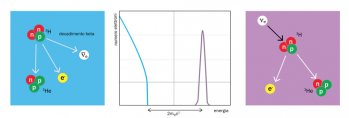 L’idea di base dei “telescopi” a trizio è di rivelare indirettamente i neutrini del fondo cosmico facendoli interagire con nuclei di trizio (un isotopo dell’idrogeno). Nel processo di cattura di questi neutrini (a destra) i nuclei di trizio emettono elettroni che hanno un picco di energia (in viola nel grafico) spostato di 2mνc2, cioè di due volte l’energia di riposo dei neutrini, rispetto al valore massimo della distribuzione di energia (curva blu nel grafico) degli elettroni emessi nel decadimento beta del trizio (a sinistra).