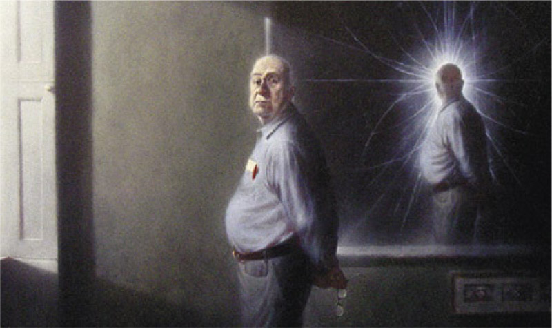 c. Peter Higgs in una rappresentazione del pittore londinese Ken Currie, del 2008. Il quadro è ospitato alla School of Informatics dell’Università di Edimburgo, in onore di Christopher Longuet-Higgins, chimico teorico e scienziato cognitivista, uno dei padri degli studi sull’intelligenza artificiale, del quale Higgs fu studente al King’s College di Londra.