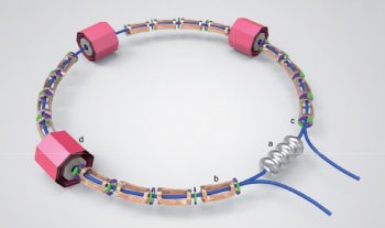 a.Le componenti principali di un acceleratore di particelle tipo Lhc: cavità acceleratrici a radiofrequenza (a), magneti dipolari (b) per guidare il fascio e magneti quadrupolari (c) per focalizzarlo. Sono raffigurati anche tre rivelatori di particelle (d).