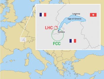 c.Collocazione dell’anello di 100 chilometri Fcc tra la Svizzera e la Francia, in rapporto all’attuale di Lhc.