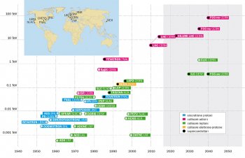 d.Evoluzione degli acceleratori nel tempo. Si può notare l’impatto della superconduttività. Ovviamente le date per i futuri acceleratori sono tutte altamente ipotetiche (vd. anche in Asimmetrie n. 6 Acceleratori, non solo ricerca fig. b, ndr).