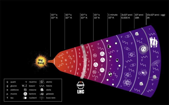 Rappresentazione schematica dell'evoluzione dell'universo. SuperB riuscirà ad andare "indietro nel tempo", come Lhc. Se il punto di forza di Lhc è l'altissima energia a cui avvengono le collisioni, SuperB studierà eventi rarissimi grazie all'elevatissima luminosità che potrà raggiungere.