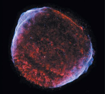 b.Immagine del resto di supernova SN 1006 acquisita con il satellite Chandra. Il colore rosso indica le emissioni X prodotte da gas ad altissima temperatura (milioni di gradi) e i colori blu e viola indicano la presenza di raggi X prodotti dall’accelerazione di elettroni. SN1006 è un candidato anche per l’accelerazione di protoni e nuclei.