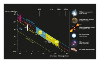 c.Il diagramma di Hillas permette di identificare, con buona approssimazione, le classi di sorgenti candidate per la produzione di raggi cosmici di alta energia, secondo una relazione che lega il campo magnetico, espresso in Gauss, e le dimensioni della sorgente, in metri, all’energia massima raggiungibile dai raggi cosmici prodotti in quell’ambiente astrofisico. Le rette in figura delimitano i semipiani alla destra dei quali l’accelerazione di particelle di una data energia è possibile; sono inoltre indicate le sorgenti che hanno le caratteristiche fisiche per accelerare tali particelle. In ascissa sono anche riportate le unità di misura delle distanze comunemente usate in astrofisica: 1AU (unità astronomica), corrispondente alla distanza Terra-Sole pari a circa 1,5 x 1011 m; 1 pc (parsec) corrispondente a circa 3,1 x 1016 m (cioè 3,26 anni luce) e i suoi multiplipli, il kiloparsec (103 pc) e il megaparsec (106 pc). Per confronto sono inseriti i parametri di Lhc, che accelera particelle fino a energie di circa 10 TeV.