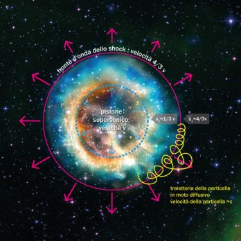 1. L’esplosione di una supernova genera un’onda d’urto nel gas interstellare. La massa espulsa preme sul gas come un pistone supersonico che si muove a velocità ν, molto minore della velocità della luce c, ma maggiore della velocità del suono nel mezzo. Seduti sul fronte dell’onda d’urto, che si propaga con velocità 4/3 ν, il mezzo interstellare ci viene incontro a velocità u1 e rallenta a velocità u2 dopo aver attraversato il fronte. Il moto diffusivo delle particelle all’interno del gas, dovuto alla presenza di campi magnetici, consente di attraversare il fronte d’onda diverse volte prima che le particelle siano trasportate via. Ad ogni attraversamento la particella guadagna un’energia proporzionale alla sua energia iniziale moltiplicata per 4/3 ν/c. Poiché le velocità u1 e u2 sono tutte molto minori della velocità della luce c, il guadagno energetico è molto piccolo e sono necessari moltissimi attraversamenti prima che la particella acquisti le enormi energie rivelate a terra.