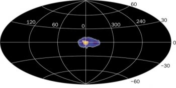 c. L’immagine della Galassia ottenuta con i fotoni di energia 511 keV. Al centro, l’emissione del bulge galattico di forma sferica. Più aIl’esterno il raccordo tra il bulge e il disco di forma ellittica. Si nota che a destra (a longitudini crescenti) la regione è più estesa.