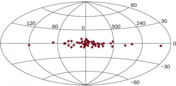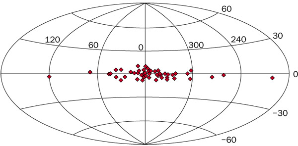 d. L’effetto è più chiaro se si sommano tutti gli eventi entro una latitudine di 10° e si riproduce una mappa unidimensionale in longitudine. Il bulge è molto luminoso al centro e si estende per circa 10° a destra e a sinistra. Le ali si estendono sino a circa ±50° ma l’ala a destra è il doppio di quella a sinistra.