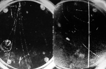 Fotografie di tracce osservate in una camera di Wilson, di diametro di circa 30 cm. Uno sciame di elettroni e positroni, a sinistra, una singola particella ionizzante, a destra.
