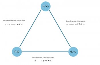 Il cosiddetto “triangolo di Puppi”, che illustra il fatto che tre processi diversi (decadimento β, decadimento del muone e cattura muonica) sono accomunati dalla stessa costante di accoppiamento, essendo dovuti alla stessa interazione universale, l’interazione debole.