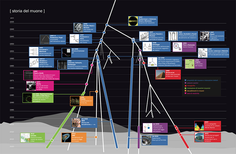 A metà degli anni ’30 si conoscevano l’elettrone, il positrone, il protone, il neutrone ed era stata ipotizzata l’esistenza del neutrino. Era un’epoca di grande fermento culturale e di progresso tecnologico. Erano state formulate le prime teorie delle interazioni tra particelle: la teoria del decadimento β (vd. fig. d) da Enrico Fermi nel 1934, la teoria delle “forze nucleari” da Hideki Yukawa nel 1935, la teoria quantistica della radiazione elettromagnetica da vari studiosi, tra cui Paul Dirac, Werner Heisenberg, Wolfgang Pauli, Viktor Weisskopf e Walter Heitler (quest’ultimo l’aveva esposta in un suo famoso trattato del 1936). I fisici sperimentali avevano sviluppato tecniche per rivelare le particelle ionizzanti con la camera di Wilson e il contatore di Geiger-Müller, e con questi strumenti si studiavano le particelle prodotte in interazioni dei raggi cosmici nell’atmosfera. Gli esperimenti erano condotti per lo più in alta montagna, al Pike’s Peak sulle Montagne Rocciose, al Pic du Midi sui Pirenei e al Plateau Rosa sulle Alpi. Nel 1932, studiando le tracce in una camera di Wilson, Carl Anderson e Seth Neddermeyer osservarono una particella che non si poteva identificare né con il protone né con l’elettrone. La nuova particella, a differenza degli elettroni, rilasciava tracce più nitide e definite e sembrava non perdere energia lungo il percorso. L’anno successivo, Jabez Street ed Edward Stevenson stimarono che questa particella avesse una massa intermedia tra quella dell’elettrone e quella del protone e, per questo, fu chiamata “mesotrone”, oppure semplicemente “mesone” (da