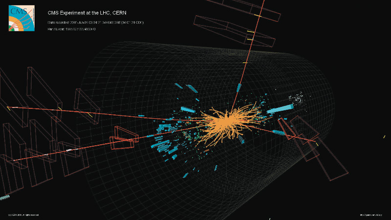 Visualizzazione di un evento di produzione di una coppia di bosoni Z, prodotti di decadimento del bosone di Higgs, in cui si possono osservare quattro muoni (le linee rosse).