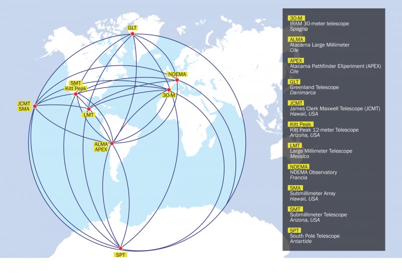 c. La rete di radiotelescopi che costituisce l’Eht, ovvero il grande interferometro a lunga distanza che ha consentito di costruire l’immagine del buco nero: si tratta di 11 osservatori che coprono quasi tutto il globo terrestre, dalla Groenlandia all’Antartide e dalle Hawaii all’Europa.